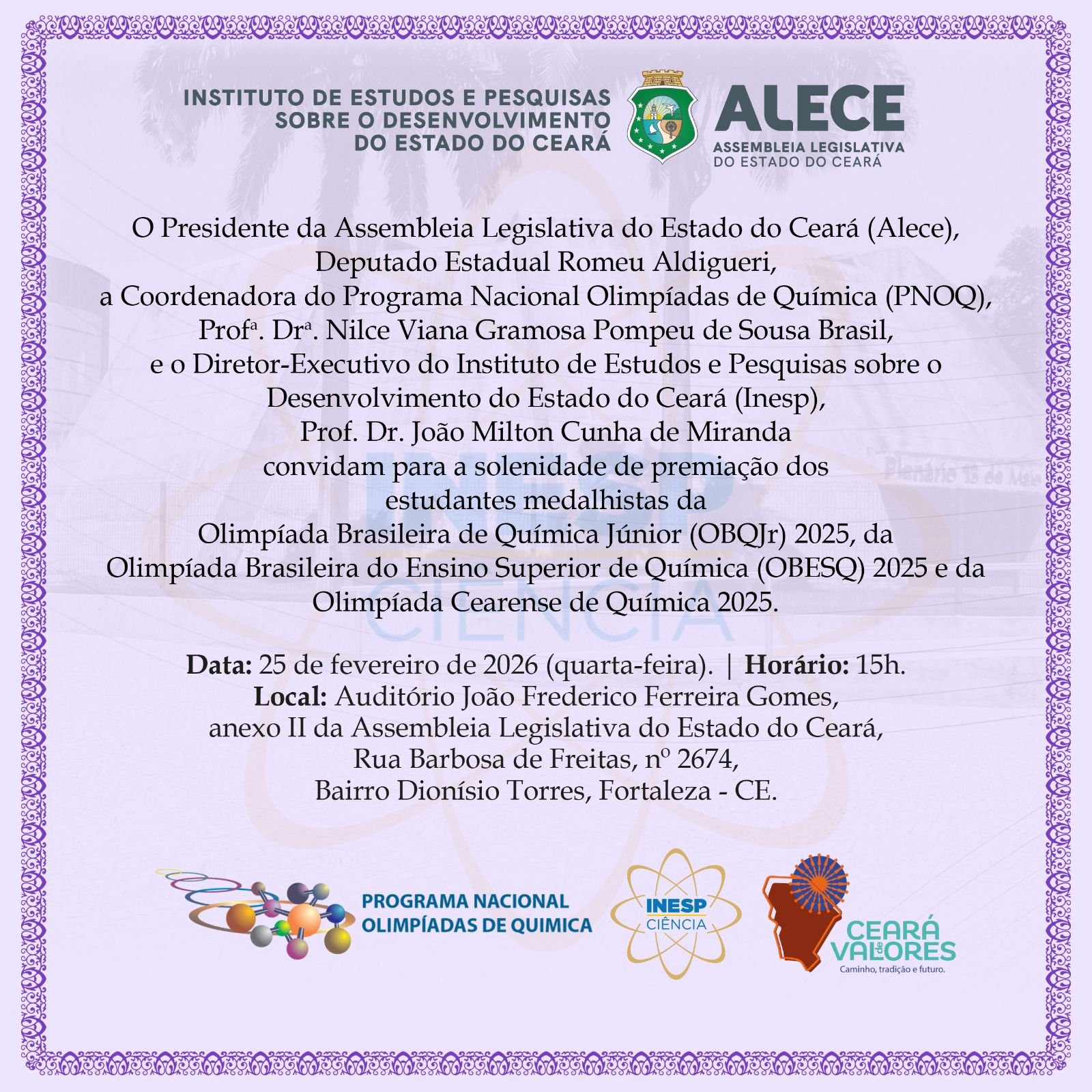 ALECE promove solenidade para premiação dos estudantes medalhistas da Olimpíada Brasileira de Química Júnior (OBQJr) fevereiro 20, 2026