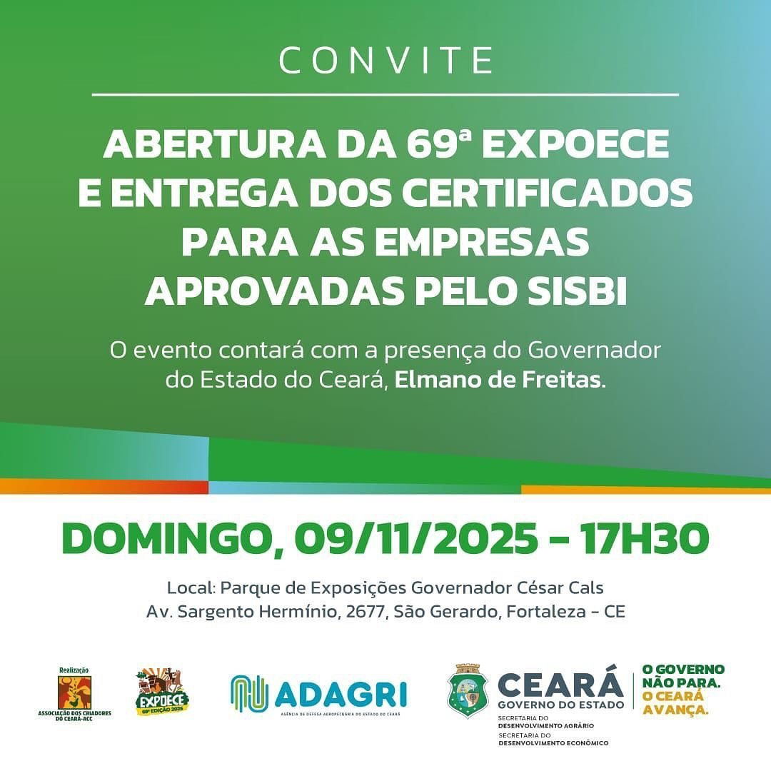 O governador Elmano de Freitas anunciará, neste domingo (9/11), a integração de cinco novas empresas cearenses ao Sisbi, durante a solenidade de abertura da Exposição Agropecuária e Industrial do Estado do Ceará (Expoece), no Parque de Exposições Governador César Cals, em Fortaleza.