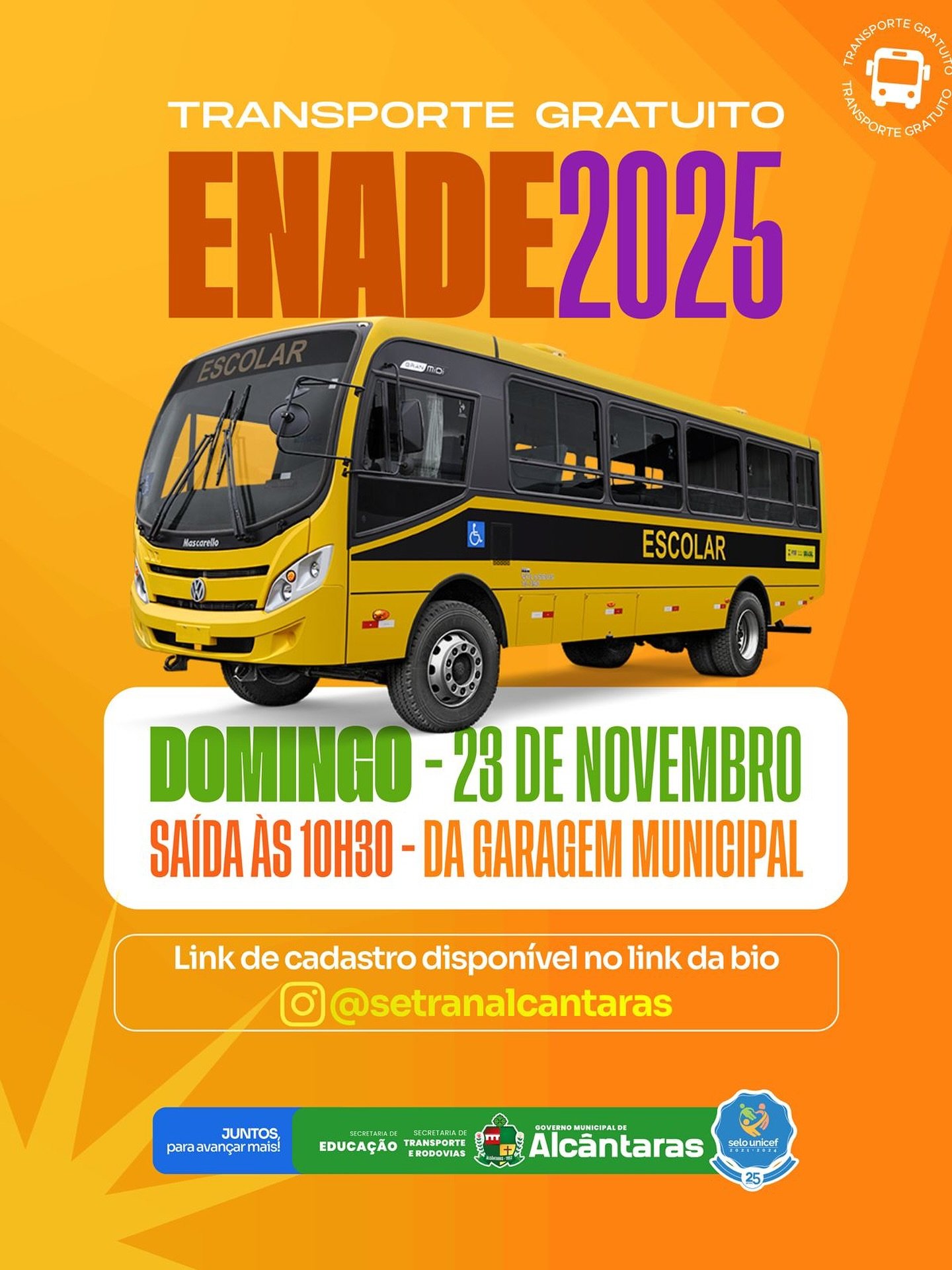 O Governo Municipal de Alcântaras reforça o compromisso com a educação ao disponibilizar transporte gratuito para os estudantes do município que participarão do Enade 2025. A ação, organizada pela Secretaria de Educação em parceria com a Secretaria de Transporte e Rodovias, busca garantir que todos os alunos tenham condições seguras e acessíveis de chegar ao local de prova.