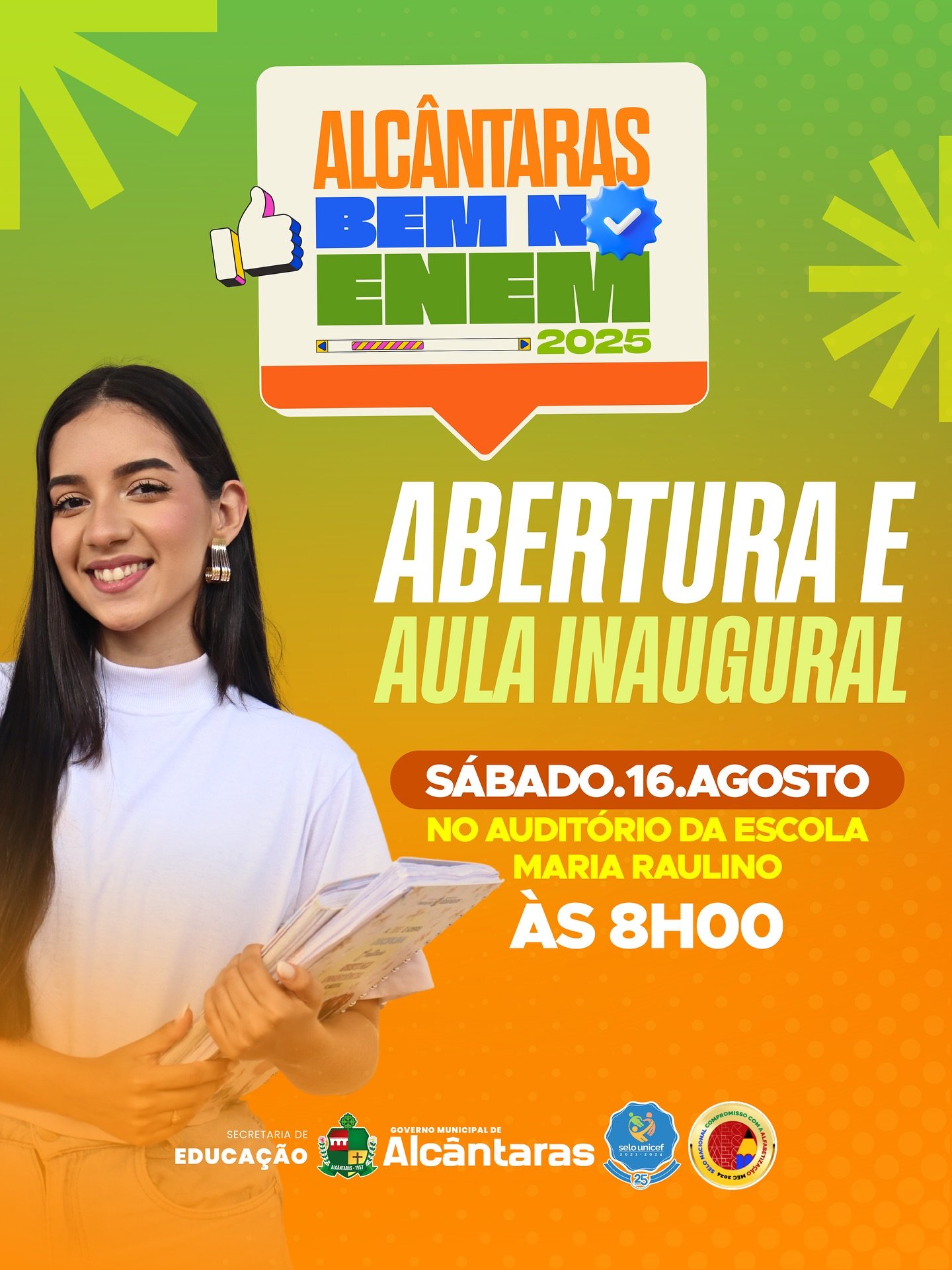 O Governo Municipal de Alcântaras, por meio da Secretaria de Educação, realizará neste sábado (16/8), a abertura oficial e a aula inaugural do programa Alcântaras Bem no ENEM 2025. O evento acontecerá às 8h, no auditório da Escola Maria Raulino, reunindo estudantes inscritos para dar início à preparação intensiva rumo a excelentes resultados no Exame Nacional do Ensino Médio.