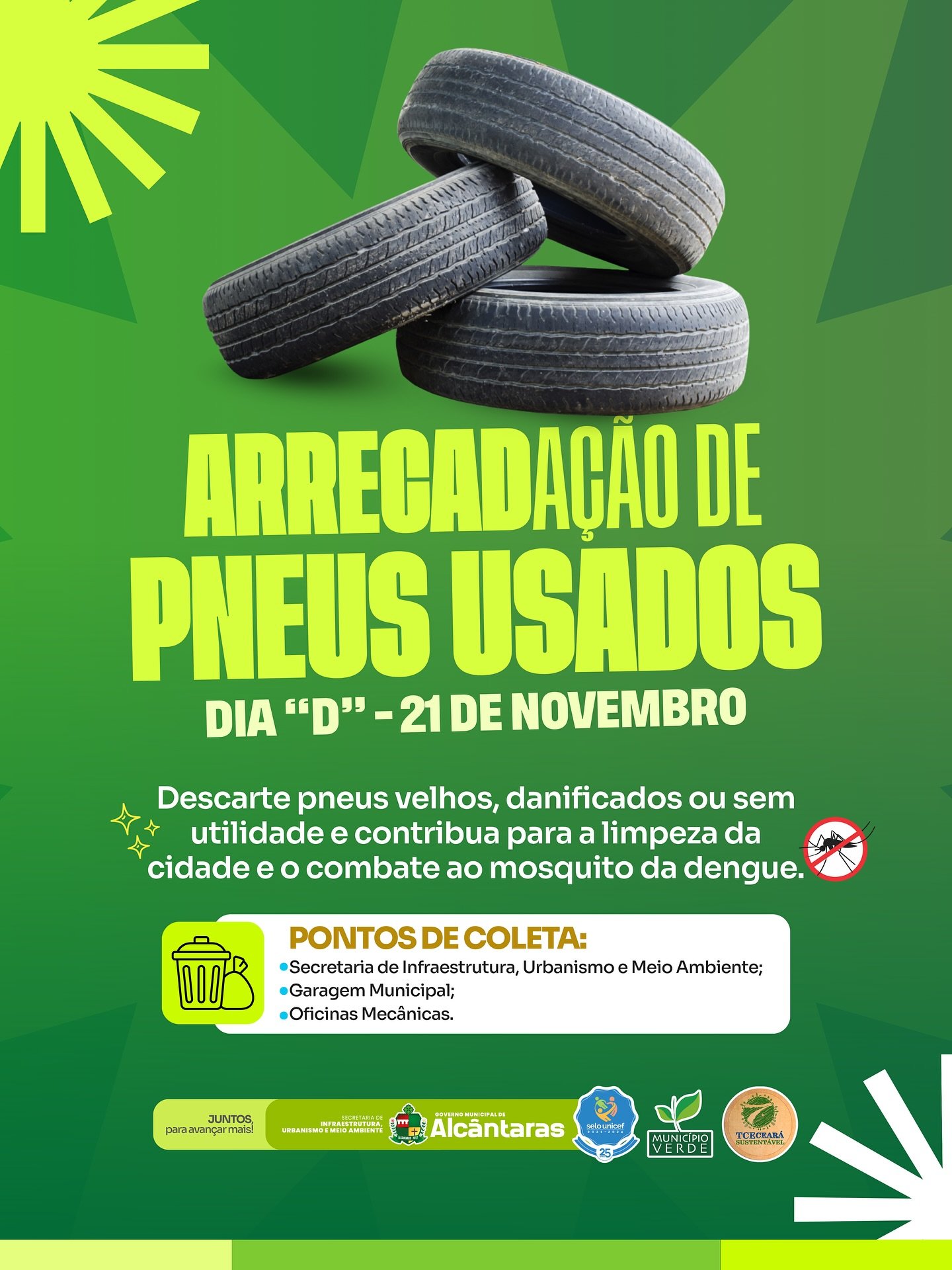 O Governo Municipal de Alcântaras, por meio da Secretaria de Infraestrutura, Urbanismo e Meio Ambiente realizará nesta quinta-feira (21/11), o Dia “D” de Arrecadação de Pneus Usados, uma ação essencial para promover a limpeza da cidade e fortalecer o combate ao mosquito da dengue. 🦟🚫