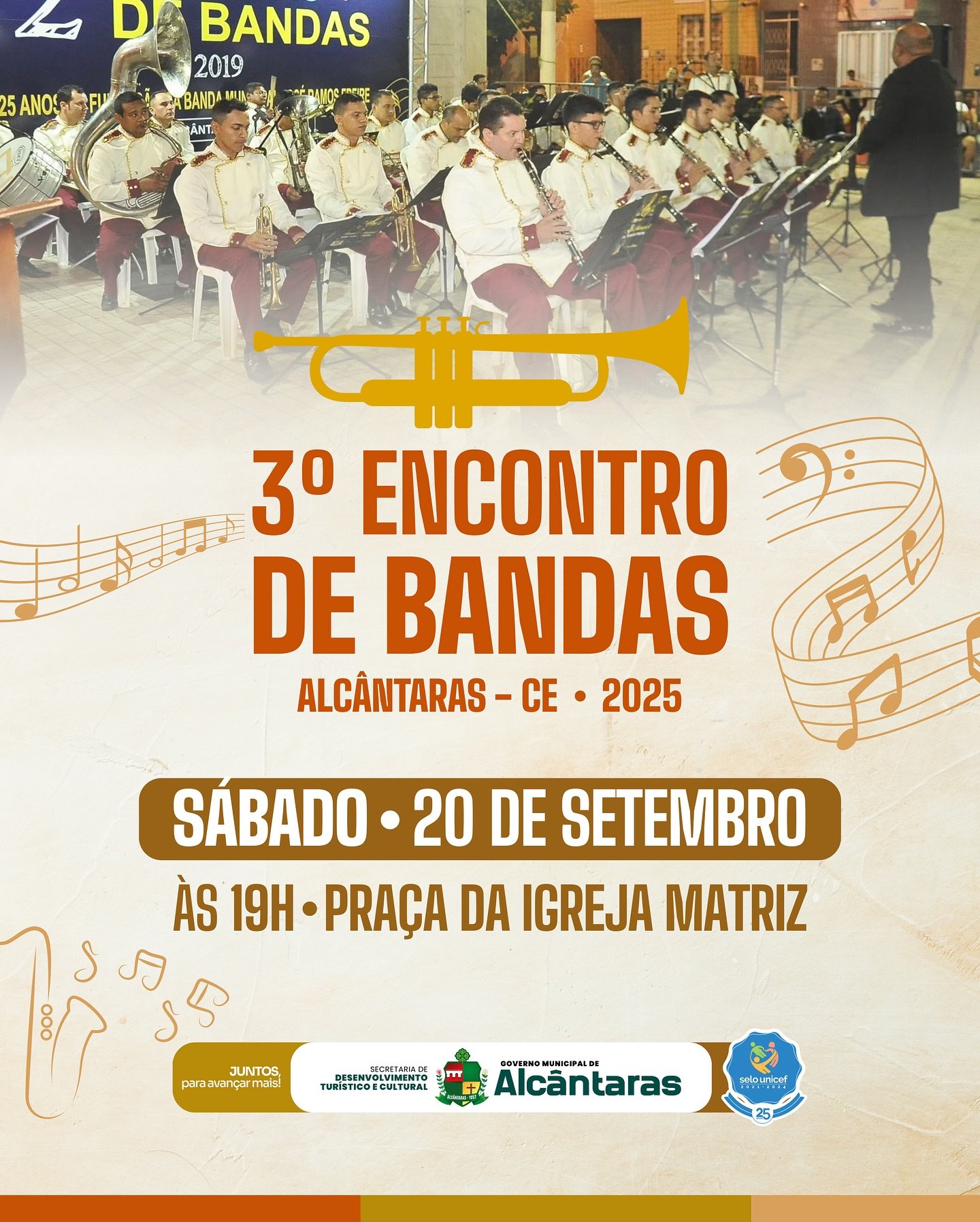Governo Municipal de Alcântaras, por meio da Secretaria do Desenvolvimento Turístico e Cultural, convida toda a população para prestigiar este grande momento de música e cultura: o 3º Encontro de Bandas do nosso município! 🎼