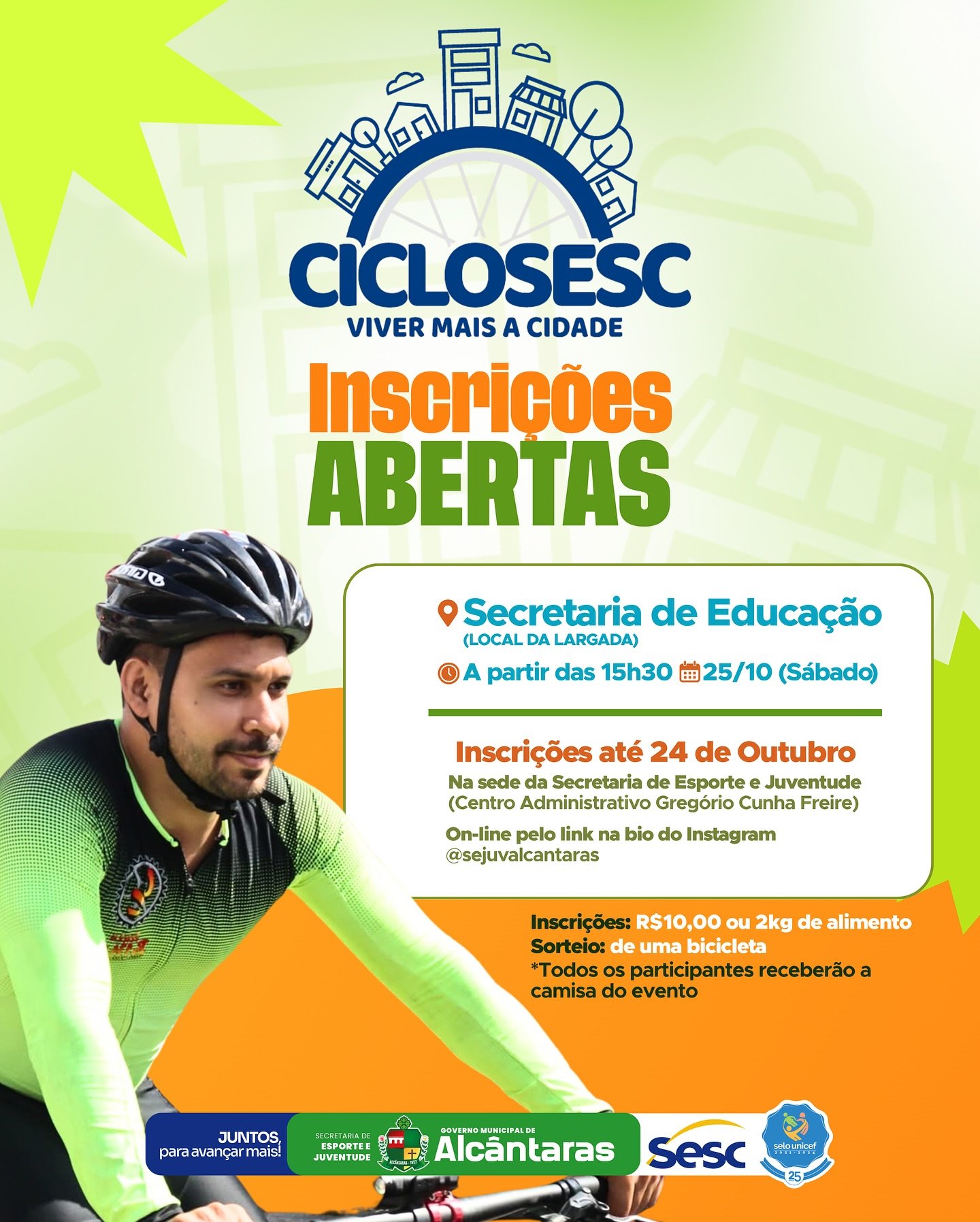 O Governo Municipal de Alcântaras, por meio da Secretaria de Esporte e Juventude, em parceria com o SESC, realizará no dia 25 de outubro (sábado) o CicloSESC 2025 – Viver Mais a Cidade!, um evento que promete movimentar o município com esporte, diversão e solidariedade. 🚴♀️🚴🏼♂️