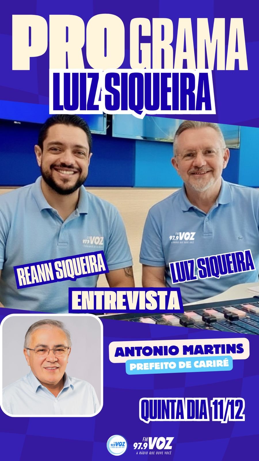 O prefeito de Cariré, Antonio Martins, será o entrevistado desta quinta-feira, 11 de dezembro, no Programa Luiz Siqueira, da rádio FM 97,9 A Voz. A conversa será conduzida pelos apresentadores Luiz Siqueira e Reann Siqueira, que recebem o gestor para um balanço das ações realizadas no município e uma análise dos projetos que estão em andamento.