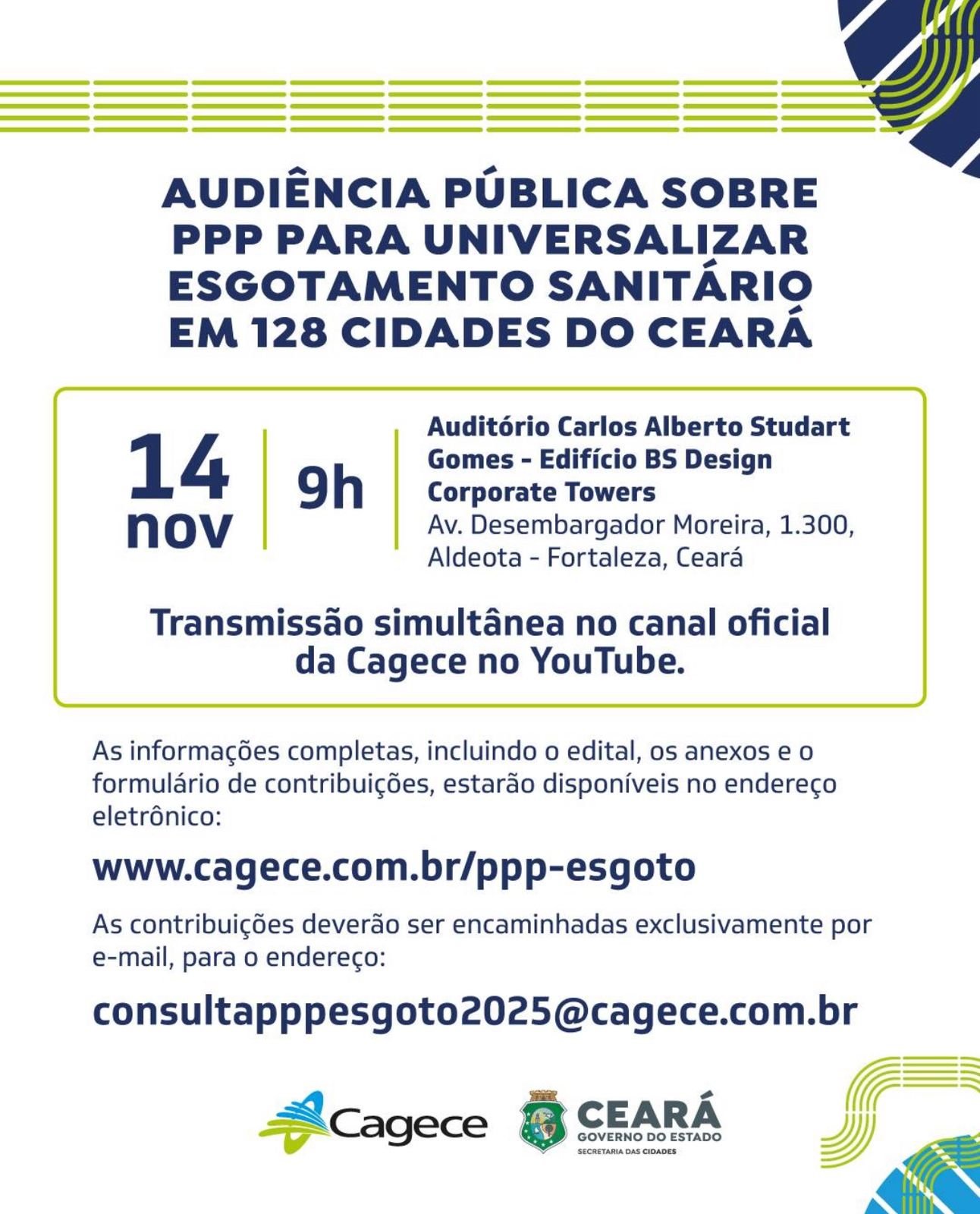 A Cagece promove, no dia 14 de novembro, às 9h, uma audiência pública para apresentar e debater o projeto de Parceria Público-Privada (PPP) que visa universalizar o esgotamento sanitário em 128 municípios cearenses. O encontro acontecerá no Auditório Carlos Alberto Studart Gomes, no BS Design Corporate Towers, em Fortaleza, com transmissão ao vivo pelo canal oficial da Cagece no YouTube.