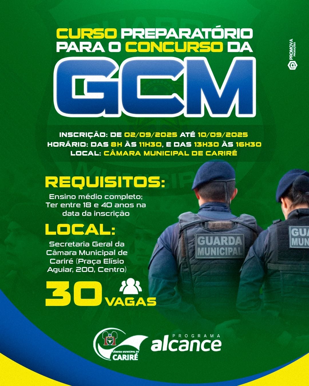 CARIRÉ Câmara Municipal de Cariré abre inscrições do Curso preparatório para o concurso da Guarda Municipal (GCM)