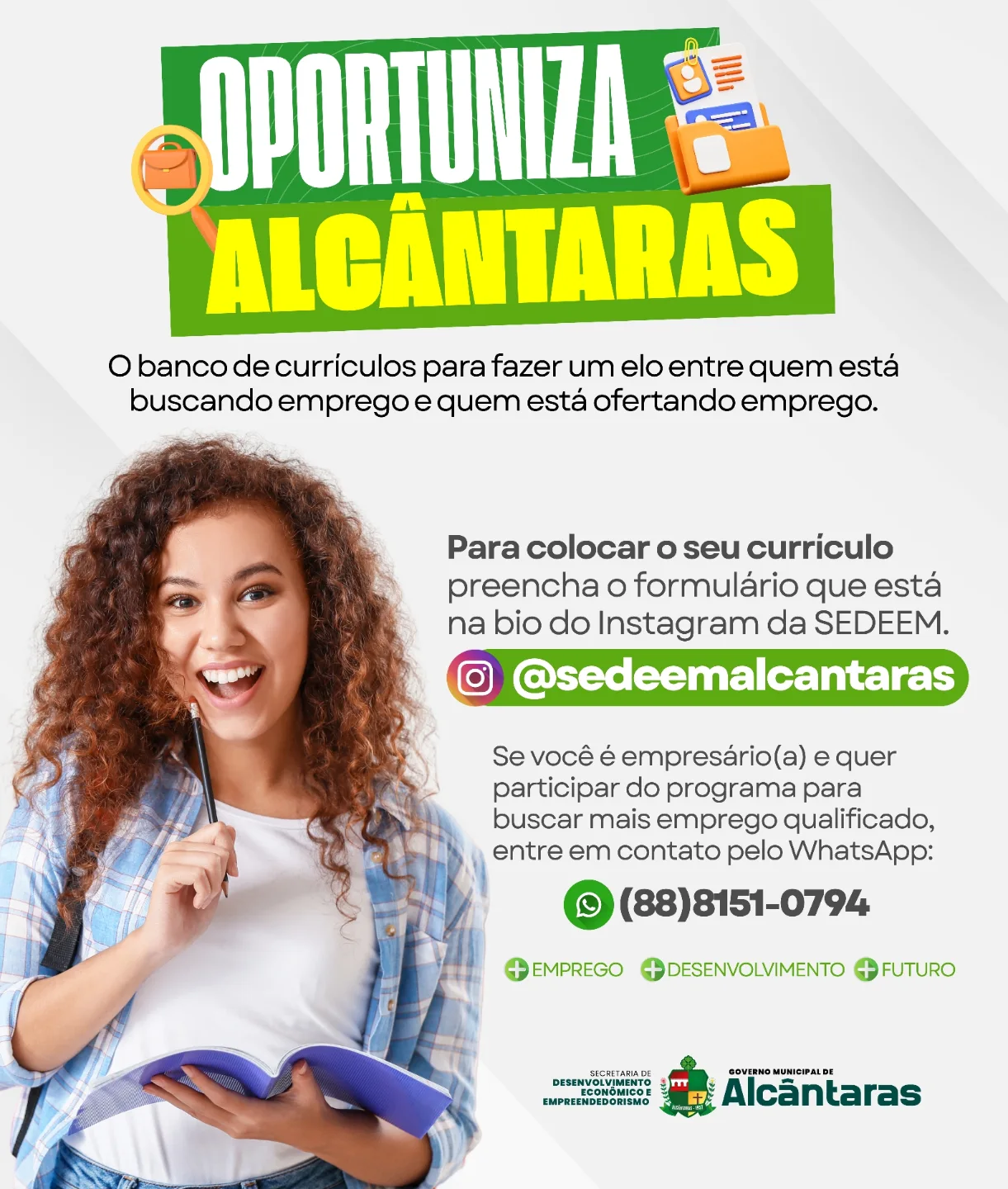 A Prefeitura de Alcântaras lançou o Oportuniza Alcântaras, uma iniciativa que vai facilitar a conexão entre quem procura emprego e quem está contratando. Trata-se de um banco de currículos online, que reúne informações de trabalhadores e oferece praticidade para empresários que buscam profissionais qualificados.