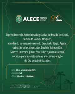 O Conselho Regional de Administração do Ceará (CRA-CE) promove na tarde desta segunda-feira (22/9), a partir das 14 horas, na Assembleia Legislativa do Ceará (Alece), um ato em comemoração aos 60 anos de regulamentação da profissão de administrador. O evento terá à frente o administrador Rogério Cristino, que também homenageará personalidades que contribuíram para o fortalecimento do CRA-Ceará.