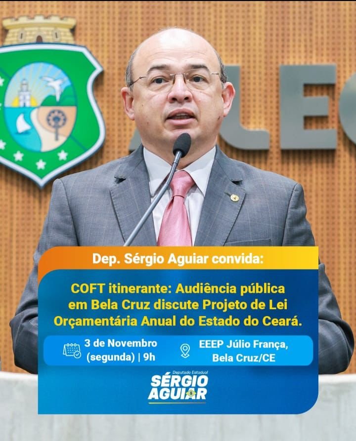 O deputado estadual Sérgio Aguiar está convidando não apenas a população de Bela Cruz, mas também todos os moradores da região do Baixo Acaraú para participar da audiência pública da Comissão de Orçamento, Finanças e Tributação (COFT) da Assembleia Legislativa do Ceará (Alece). O encontro acontecerá na próxima segunda-feira, dia 3 de novembro, às 9h, na EEEP Júlio França, em Bela Cruz.