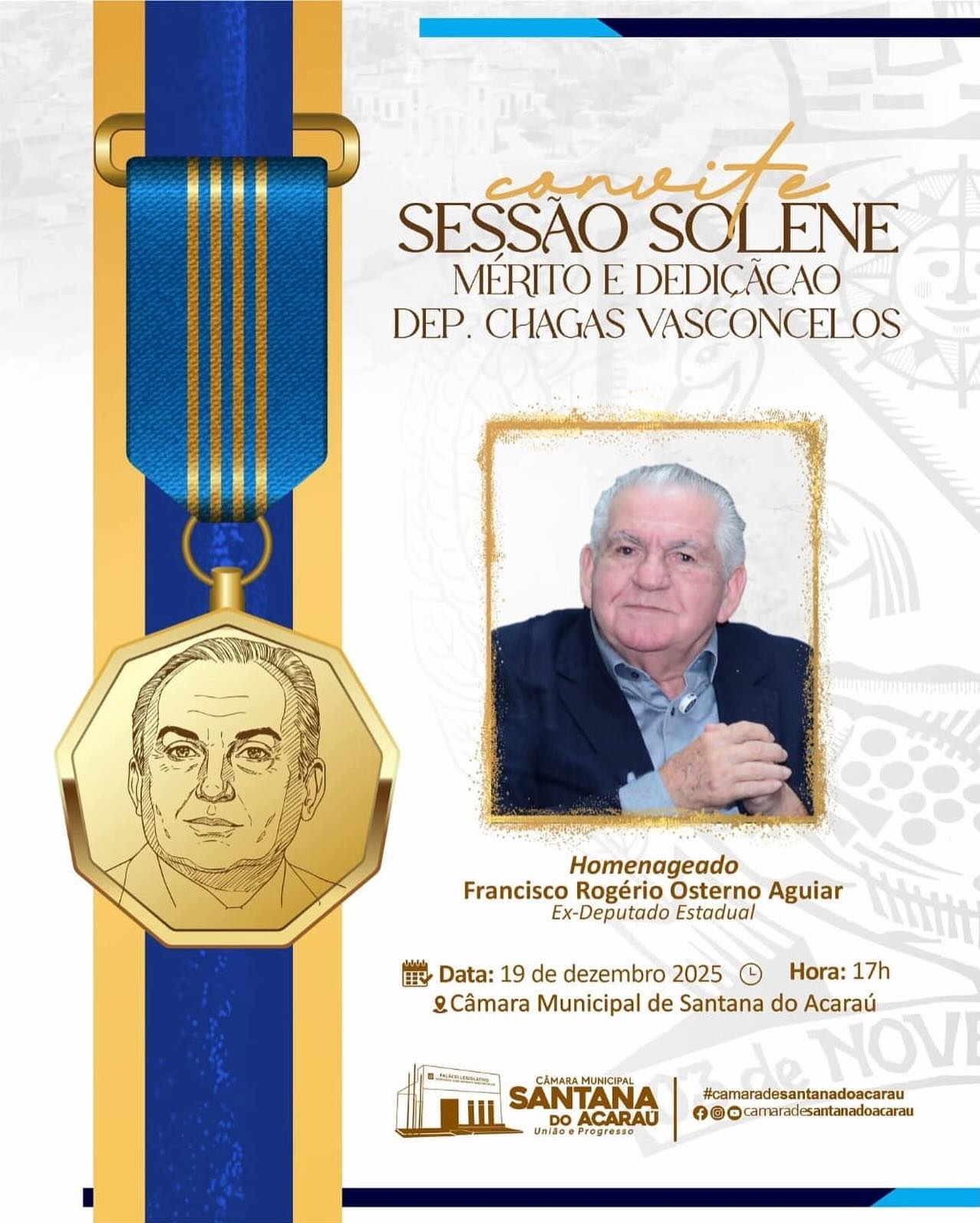 A Câmara Municipal de Santana do Acaraú realizará, nesta sexta-feira, 19 de dezembro, às 17h, uma sessão solene de mérito e dedicação, por iniciativa do deputado estadual Chagas Vasconcelos, para homenagear o ex-deputado estadual Francisco Rogério Osterno Aguiar.