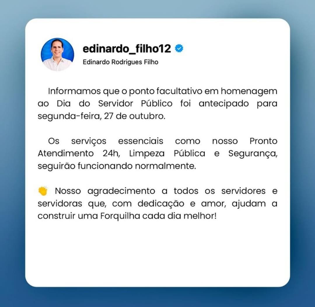 O prefeito de Forquilha, Edinardo Filho, anunciou que o ponto facultativo em homenagem ao Dia do Servidor Público será antecipado para a segunda-feira, 27 de outubro.