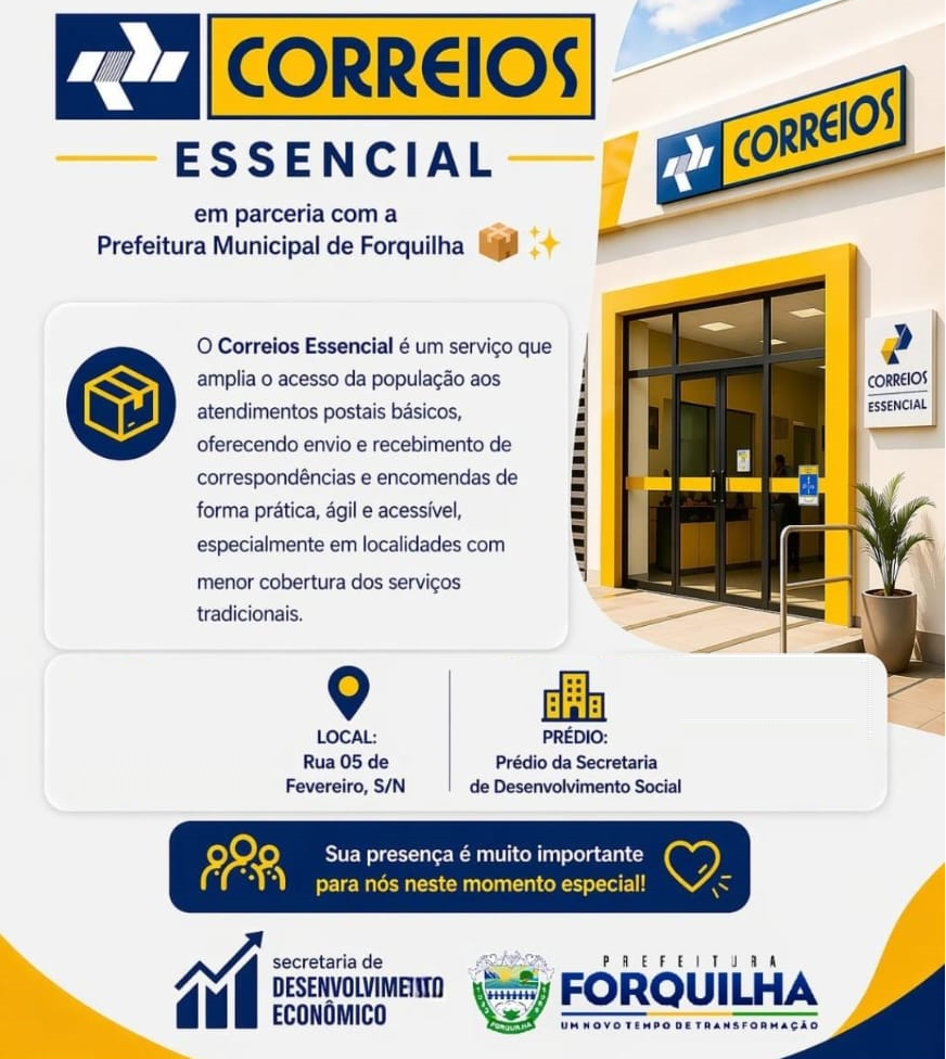 O Correios Essencial oferece envio e recebimento de correspondências e encomendas de forma prática, ágil e acessível, fortalecendo os serviços públicos e facilitando o dia a dia da população.