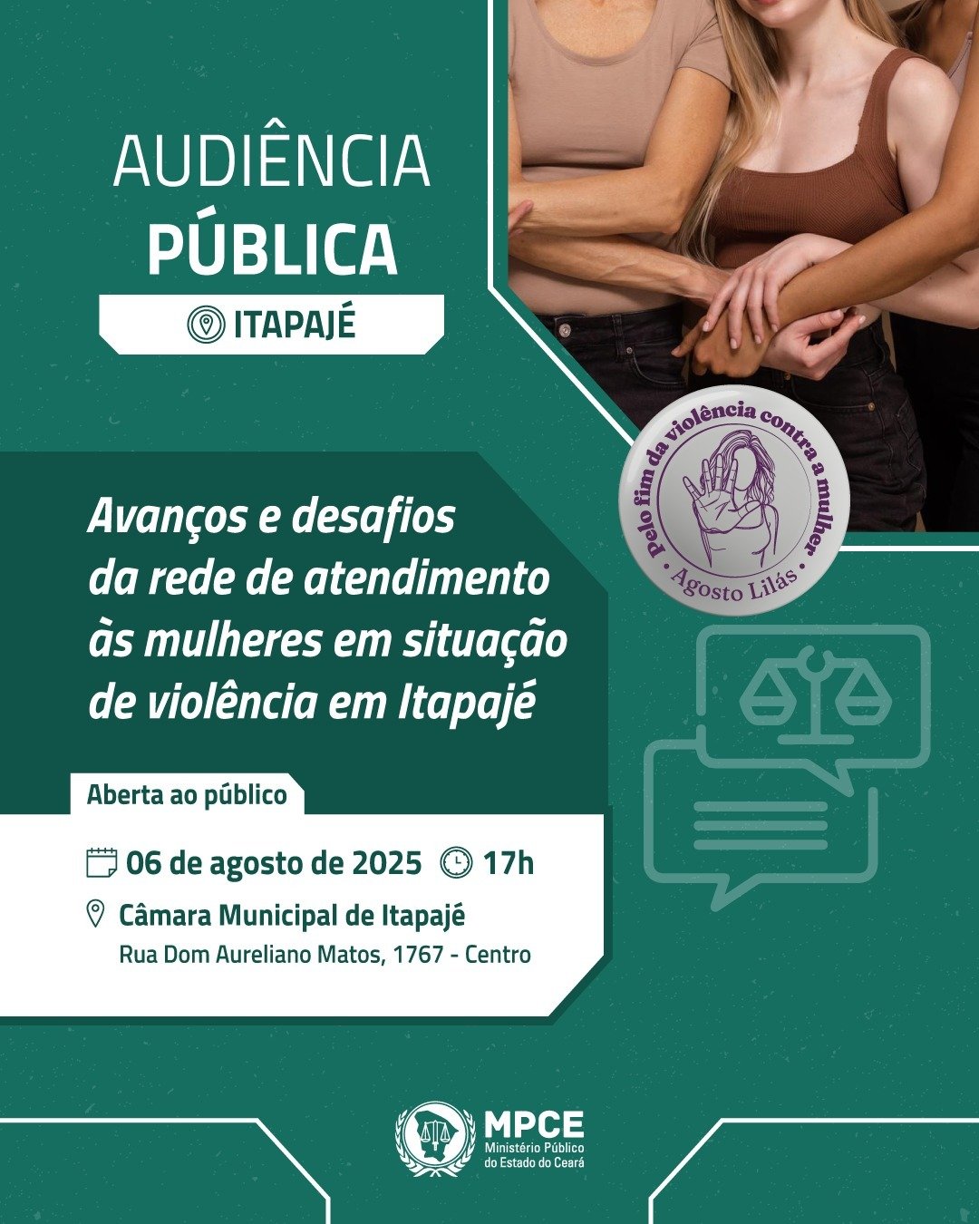 A audiência é aberta ao público e contará com a presença das promotoras de Justiça Lívia Rodrigues, coordenadora do Nuprom, e Christiane Oliveira, titular da 2ª Promotoria de Justiça de Itapajé. A finalidade do evento é fortalecer o diálogo entre instituições e sociedade civil sobre mecanismos de enfrentamento à violência contra a mulher e a melhoria da rede de apoio local.