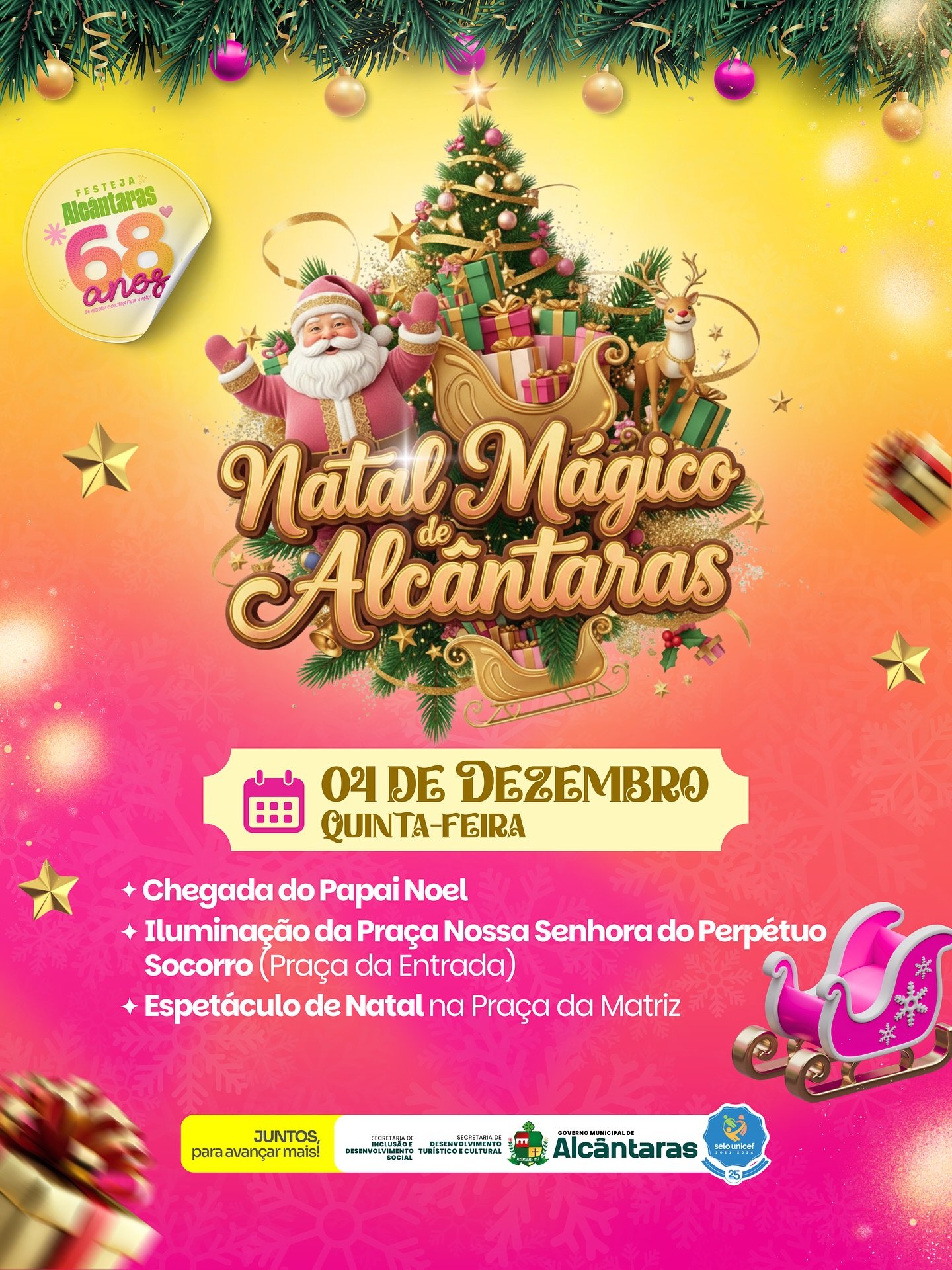 O Governo Municipal de Alcântaras, por meio da Secretaria do Desenvolvimento Turístico e Cultural e da Secretaria de Inclusão e Desenvolvimento Social, convida toda a população para vivenciar a magia do Natal Mágico de Alcântaras 2025. 😍