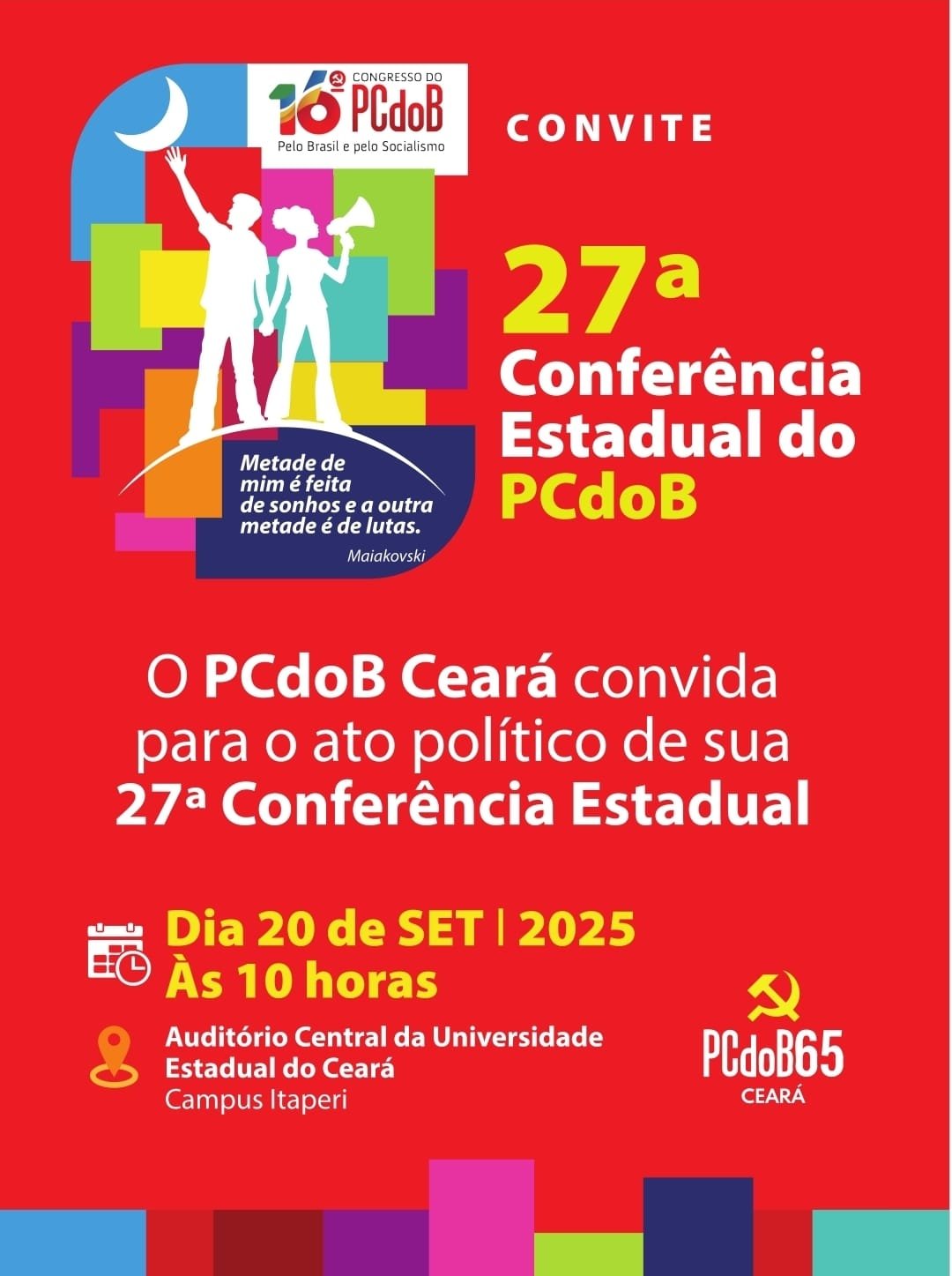O PCdoB Ceará realiza, neste sábado (20/09/2025), o ato político de sua 27ª Conferência Estadual. O encontro integra as atividades do 16º Congresso Nacional do PCdoB e vai reunir dirigentes, militantes e simpatizantes para debater rumos e estratégias do partido no estado.