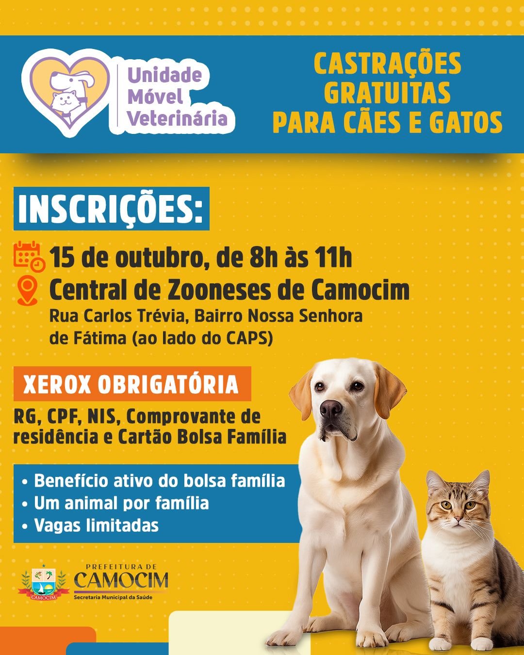 A Prefeitura de Camocim, por meio da Secretaria Municipal da Saúde, informa que a Unidade Móvel Veterinária realizará castrações gratuitas para cães e gatos. As inscrições acontecerão no dia 15 de outubro, das 8h às 11h, na Central de Zoonoses de Camocim, localizada na Rua Carlos Trévia, Bairro Nossa Senhora de Fátima, ao lado do CAPS.
