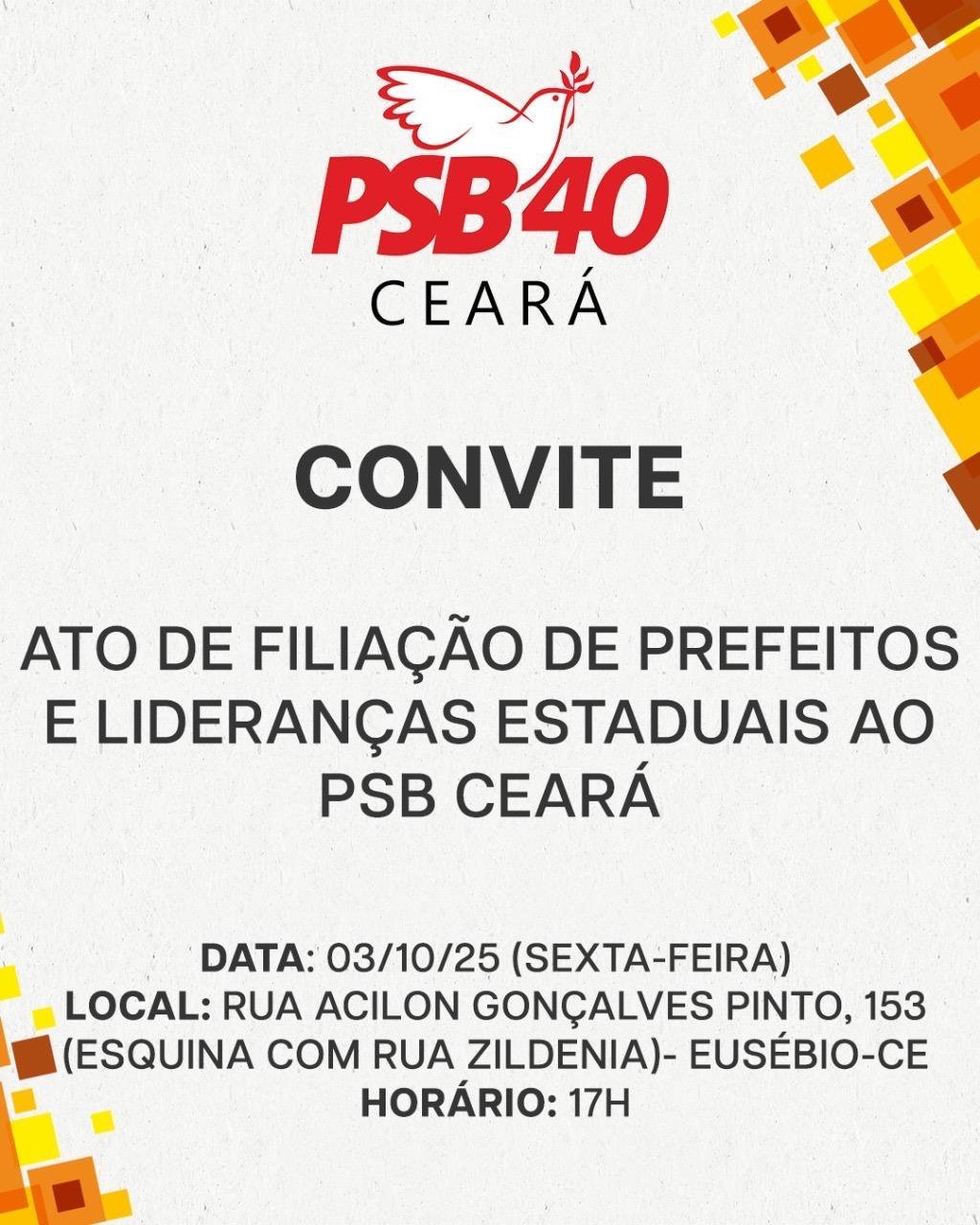 O Partido Socialista Brasileiro (PSB) do Ceará vai realizar nesta sexta-feira (03/10) ato de filiação do ex-prefeito do Eusébio Acilon Gonçalves e de prefeitos cearenses. A solenidade acontece no município do Eusébio, a partir das 17h e contará com a participação do presidente estadual do PSB, Eudoro Santana, do senador Cid Gomes, do deputado federal Junior Mano e de lideranças políticas do Estado.