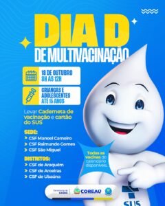 Neste sábado (18/10), vai rolar o Dia D de Vacinação em mais de 130 municípios cearenses para imunizar a população contra várias doenças. Crianças e adolescentes são o principal público, mas qualquer pessoa de outra faixa etária pode se vacinar. 👶🏻👩🏼🦱👵🏽 Ou seja, dá pra atualizar a caderneta da netinha e também da vovó. Já manda esse post no grupo da família pra ninguém perder.