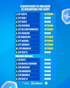 O reconhecimento é resultado direto da dedicação e do esforço diário dos profissionais que atuam nas unidades de saúde do município, contribuindo de forma significativa para a melhoria dos serviços oferecidos e para a qualidade de vida dos coreauenses.