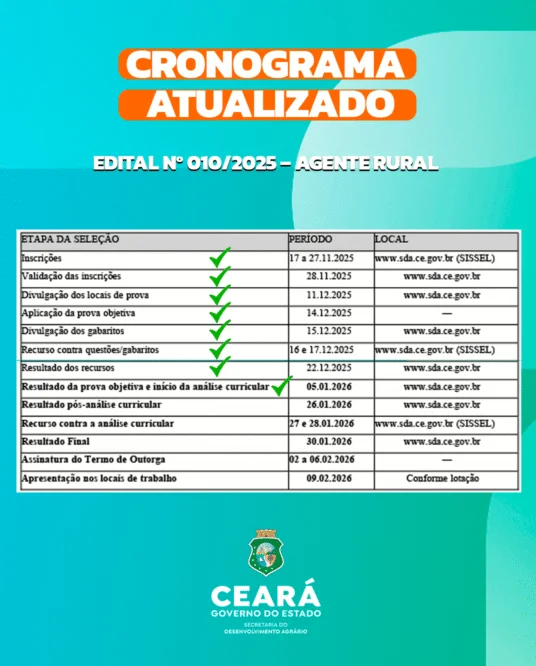 O certame oferta o total de 801 vagas imediatas, além da formação de cadastro de reserva, com distribuição em diversas regiões do Ceará. Tem como objetivo fortalecer as ações de assistência técnica, mobilização social e desenvolvimento da agricultura familiar no estado.