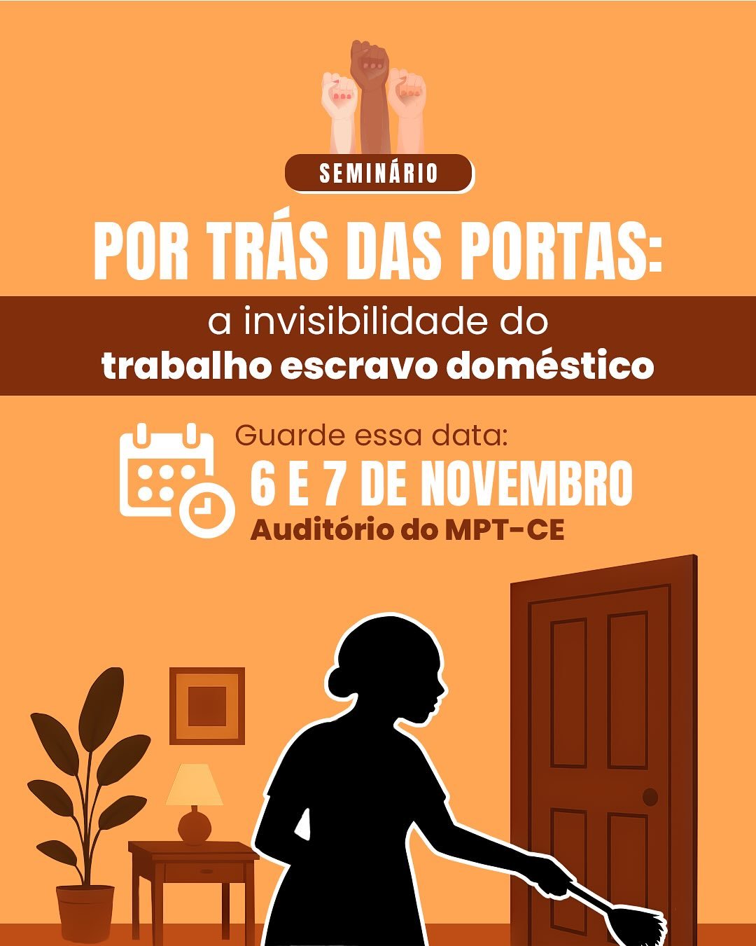 Nos dias 6 e 7 de novembro, o auditório do Ministério Público do Trabalho no Ceará (MPT-CE) será palco do seminário “Por trás das portas: a invisibilidade do trabalho escravo doméstico”. A iniciativa tem por objetivo ampliar o debate público sobre uma das formas mais silenciosas e persistentes de exploração laboral no Brasil, reunindo representantes de diversas instituições para discutir estratégias de prevenção e enfrentamento.