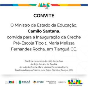 A cidade de Tianguá se prepara para viver um momento histórico no próximo 18 de novembro, as 9h, com a inauguração da Creche Maria Melyssa Fernandes Rocha, no bairro Planalto. A solenidade contará com a presença do ministro da Educação, Camilo Santana, do governador Elmano de Freitas e do prefeito Alex Nunes, reforçando o compromisso conjunto com uma educação pública de qualidade.