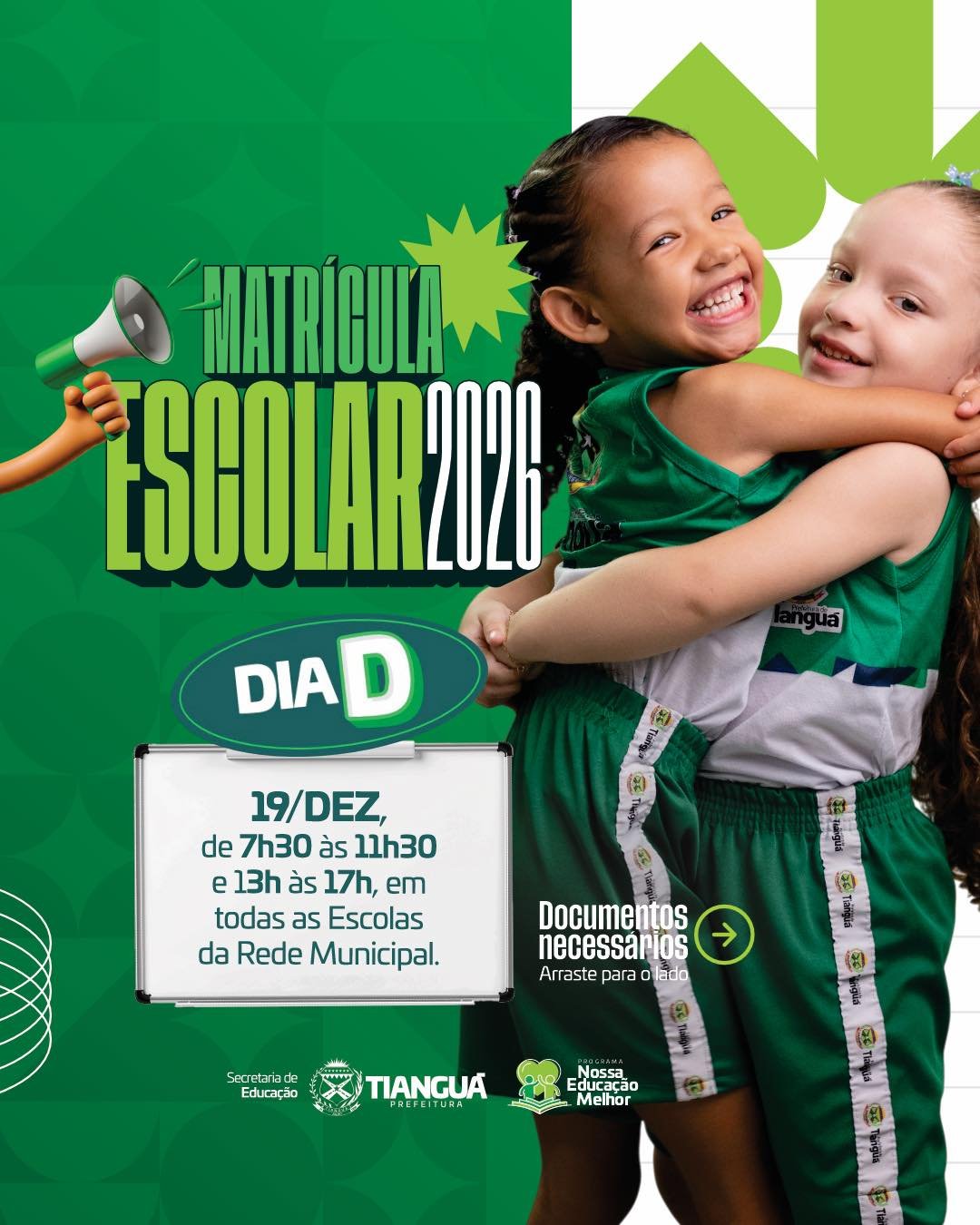 Tianguá se prepara para um momento importante na construção do futuro de crianças e adolescentes do município. No próximo 19 de dezembro, acontecerá o Dia D da Matrícula 2026, das 7h30 às 11h e das 13h às 17h, em todas as escolas da rede municipal. A iniciativa busca mobilizar pais e responsáveis para garantir a vaga dos estudantes no próximo ano letivo, fortalecendo o planejamento da educação e assegurando o atendimento de qualidade que já marca a atual gestão.